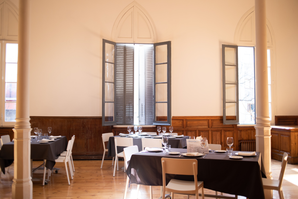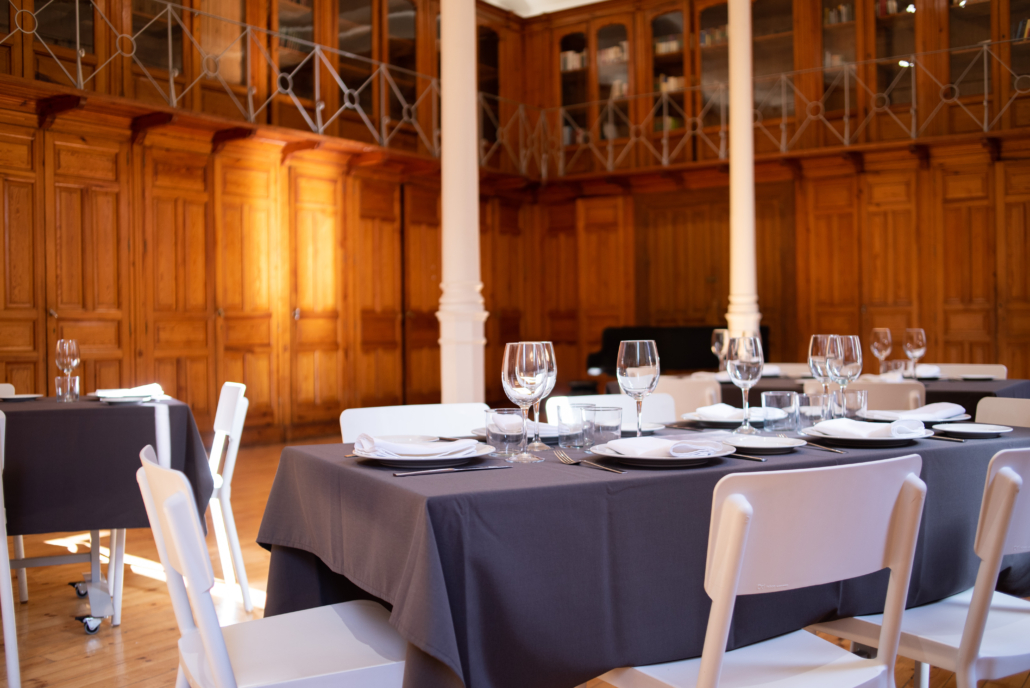 El restaurante se ubica en una antigua biblioteca de madera, un entorno singular y lleno de encanto en el Colegio Internacional G. Nicoli, en el centro de Madrid.